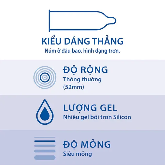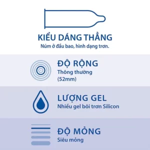 Đặc điểm: Thiết kế trơn, có gel bôi trơn sẵn, ôm sát tự nhiên.