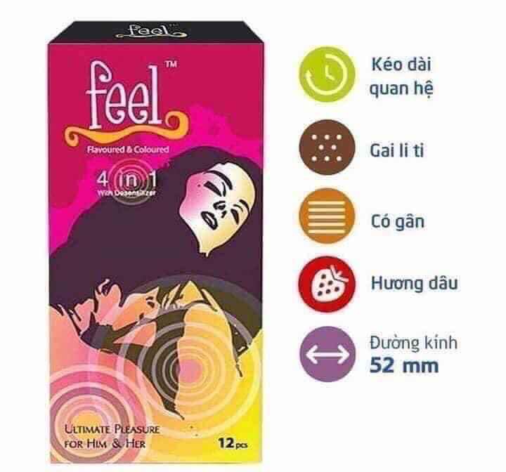 Đặc biệt Feel 4in1 có hàm lượng benzocein 8% kéo dài lâu hơn những loại bao cao su kéo dài thông thường khác ) trên thân bao có gai gân nhẹ giúp kích thích khoái cảm cho bạn tình, có mùi hương dâu nhẹ, sản phẩm xuất xứ và nhập khẩu từ Malaysia